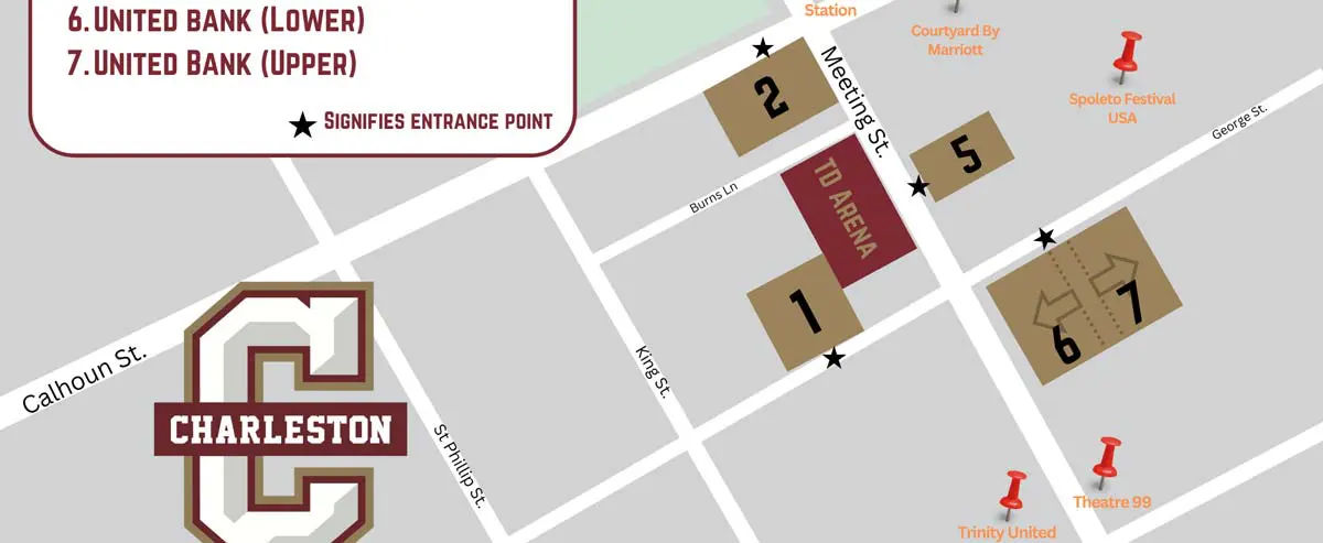 The Charleston Athletic Fund offers premium reserved parking near TD Arena for all home men's basketball games. This parking is a benefit for those members who give at the Golden Cougar level and above ($3,600+). Please refer to the map below to find your assigned lot.